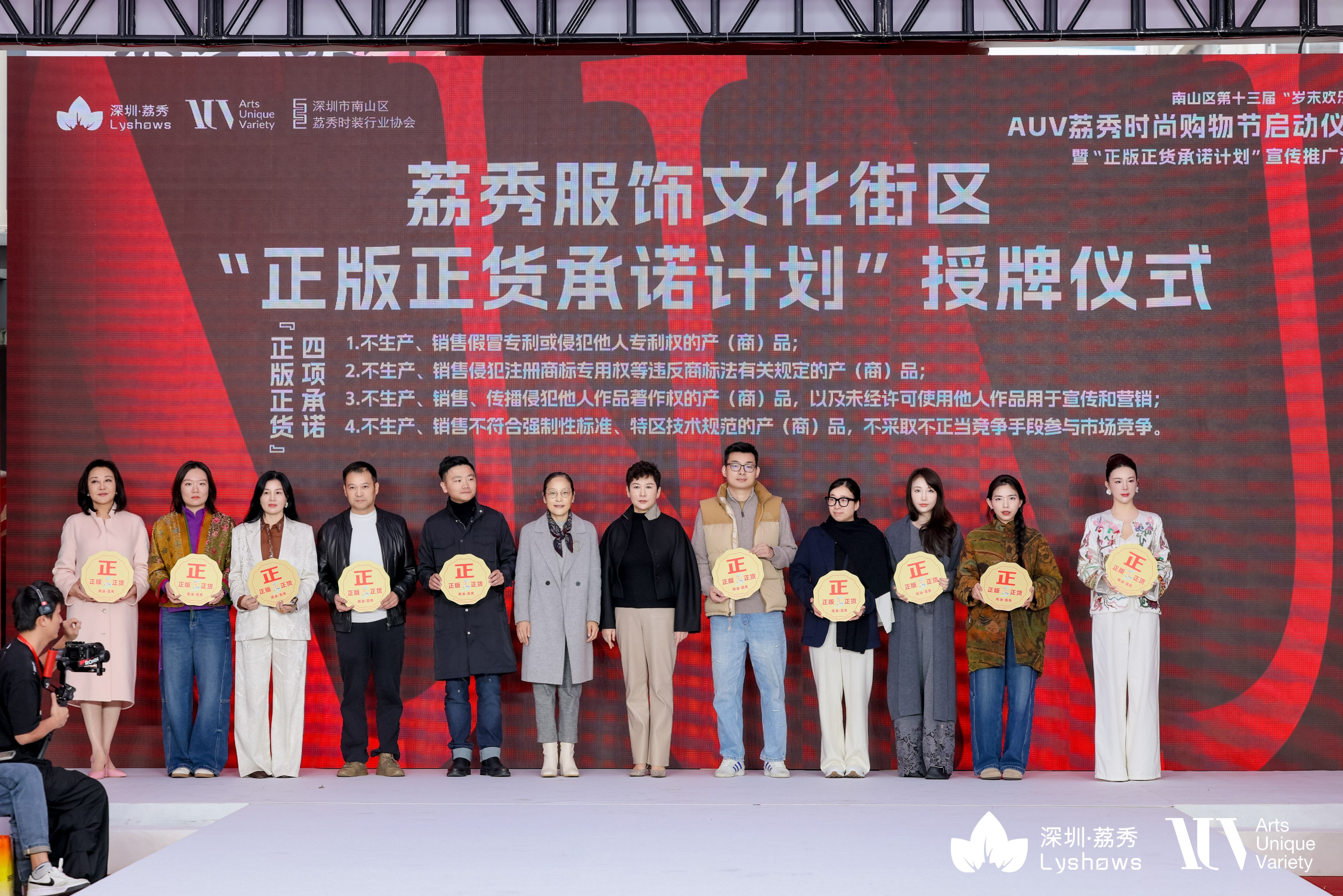 作为本次活动的核心亮点,“正版正货承诺计划”的正式推行为产业生态奠定基础。该计划由深圳市市场监督管理局南山监管局与南山街道办事处牵头,联合荔秀街区知识产权保护工作站、深圳市版权协会及南山区荔秀时装行业协会共同推进。其目标清晰明确:通过加强知识产权保护,为消费者营造放心购物的优质环境;同时为原创商户建立了商户加入机制、退出机制、宣传推广机制和快速维权机制,切实为“深圳原创设计”品牌增添更强的公信力与市场竞争力。在启动仪式上,首批申请加入荔秀街区“正版正货承诺计划”的商户集体亮相,并获颁“正版正货”标志。这20家商户将成为荔秀街区首批行业标杆,积极履行“正版正货”四项承诺,在荔秀街区发挥示范引领作用。